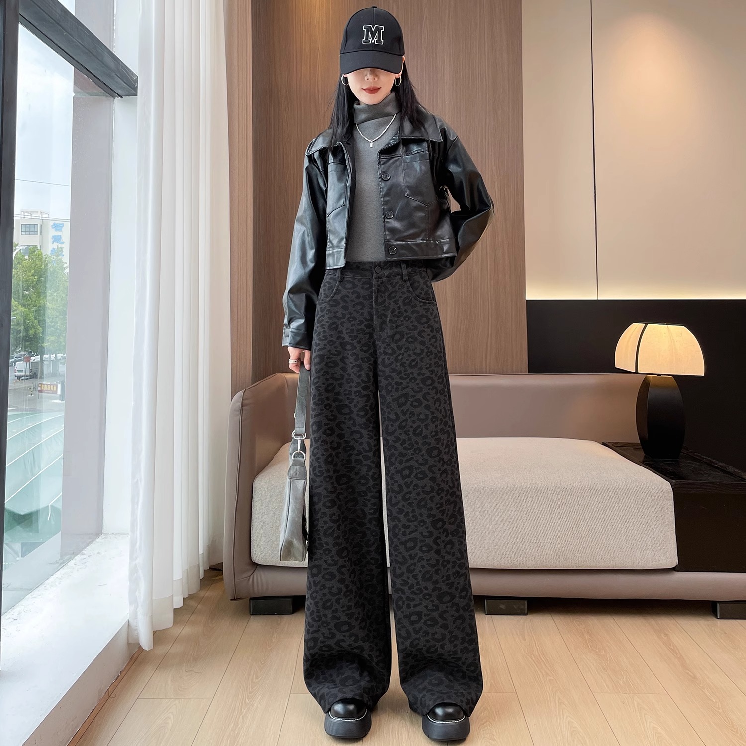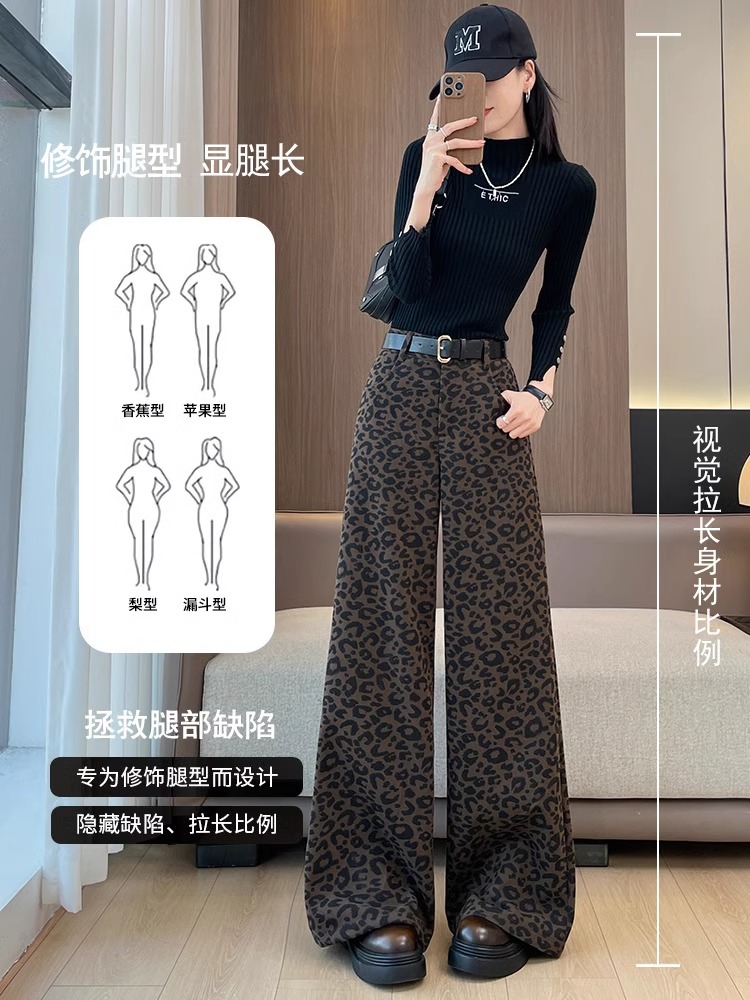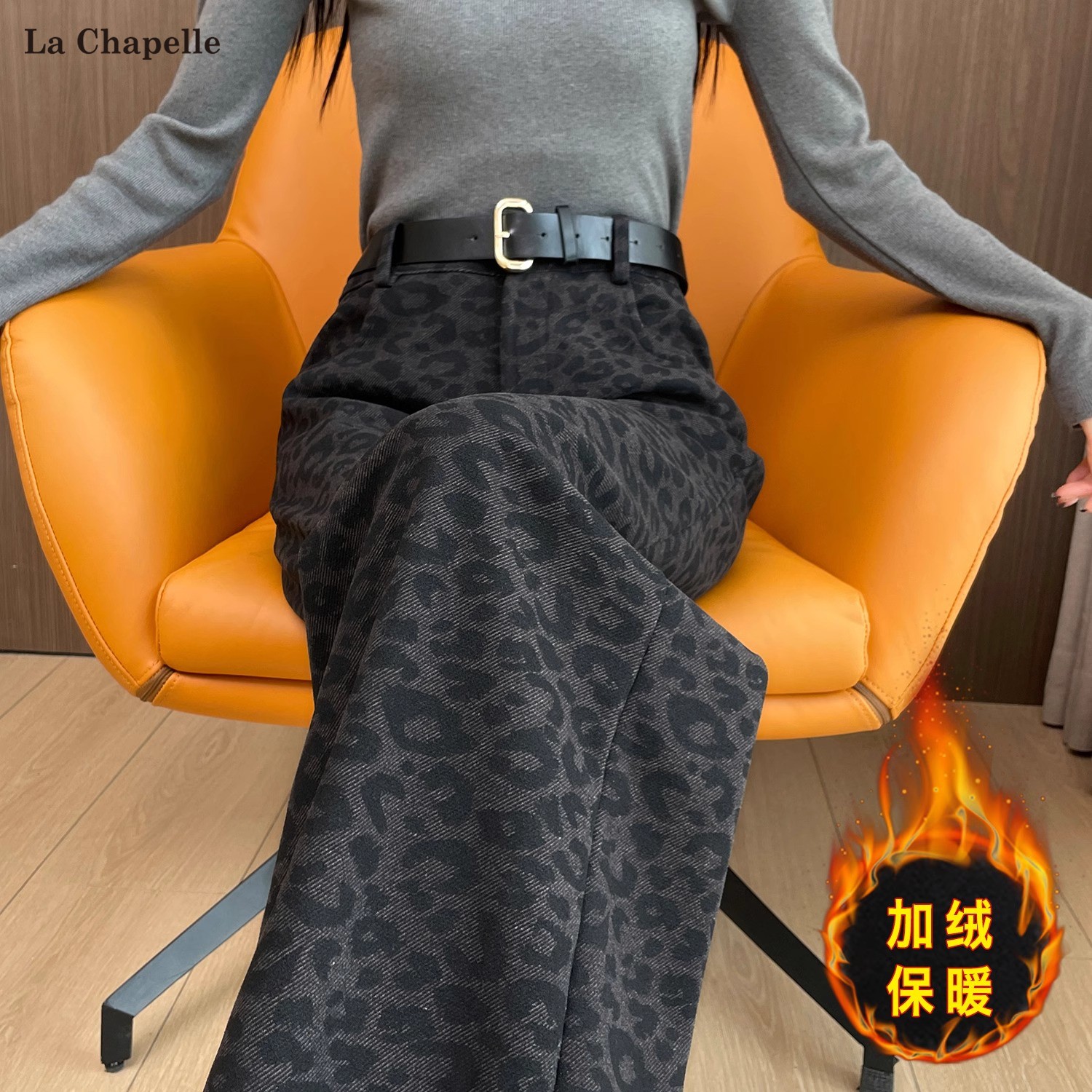La Chabel plus fluffy wide-leg pants women's 2025 autumn/winter new leopard print thickened narrow straight floor-length pants