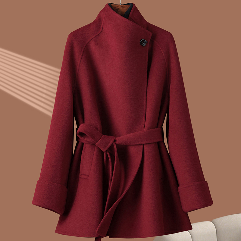 Dark blue reversible cashmere coat women's mid-length 2025 new fall/winter stand-up collar tie-up waist woolen jacket