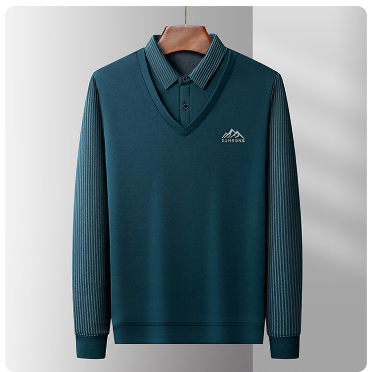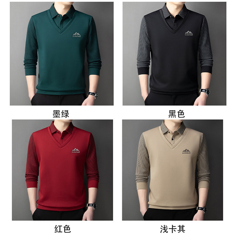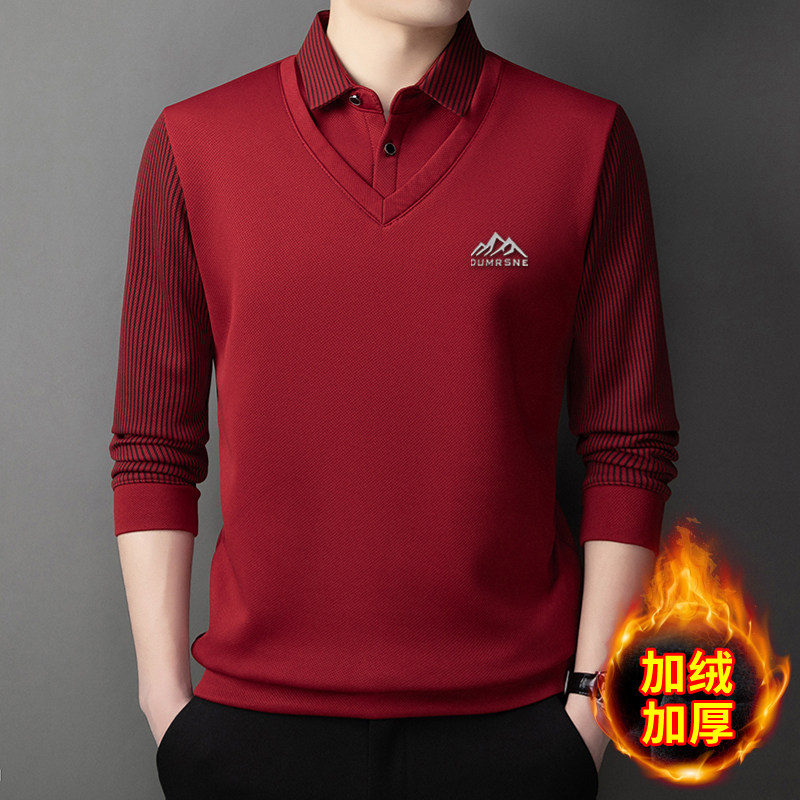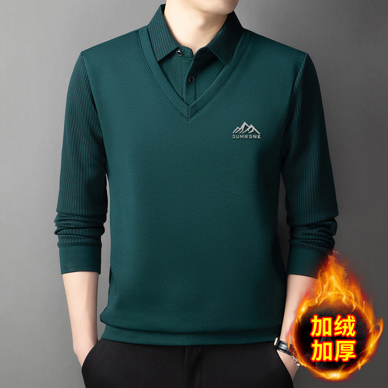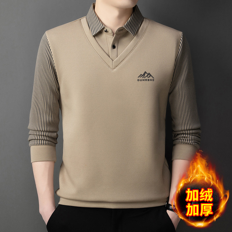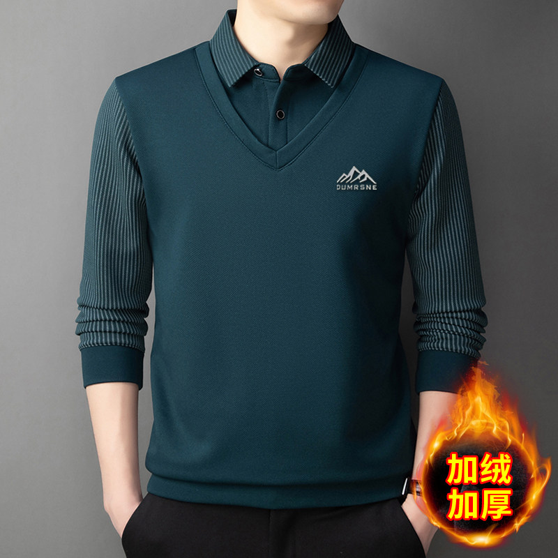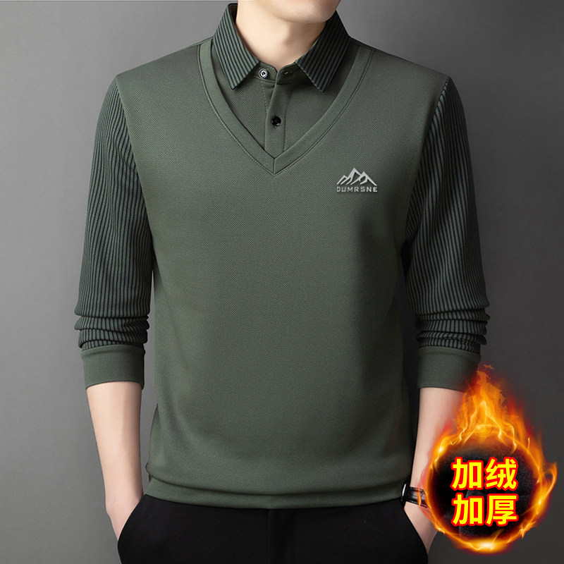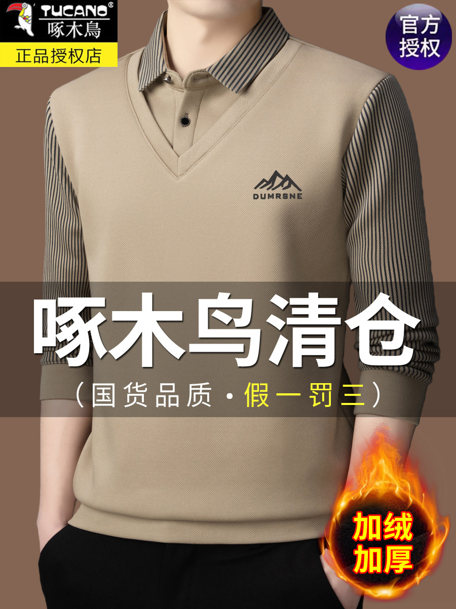 Woodpecker Autumn and Winter New High-end Men's Fleece Fake Two Printed Base Layers Thickened Shirt Collar Warm Sweatshirt